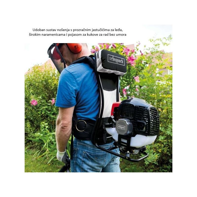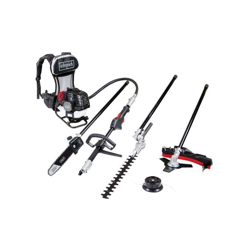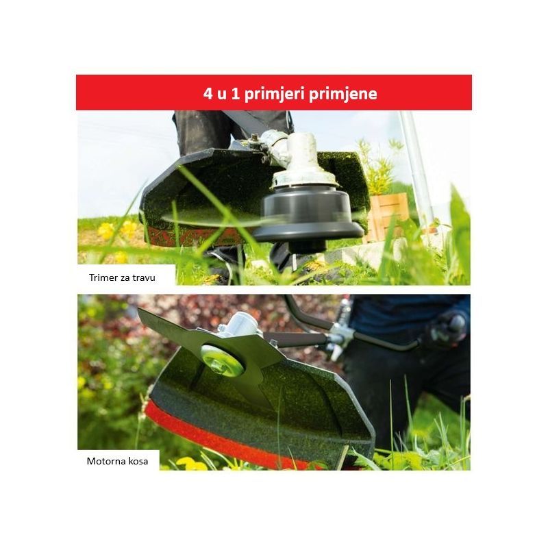 To je benzinski višenamjenski alat s ruksakom (Backpack) koji se jednim sustavom nošenja koristi kao: trimer za travu, trimer za grmlje (metalna oštrica), škare za živicu i škare/pila za orezivanje s motkom. Fokus je na fleksibilnosti: jedan pogon + više nastavaka za različite zone okućnice.