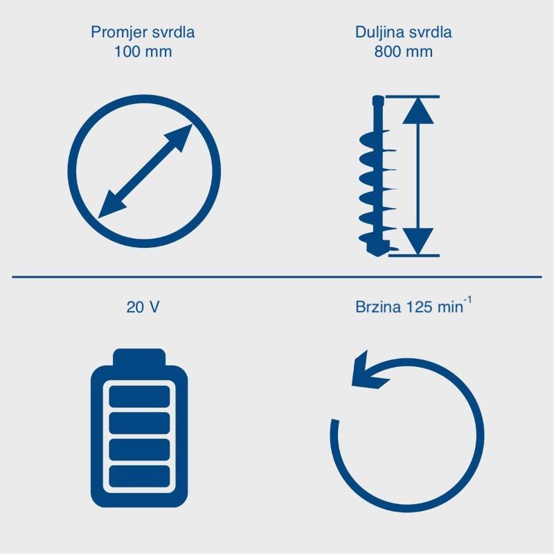 Svrdlo je Ø 100 mm i duljine 800 mm. Operativno: Ø100 mm je tipičan promjer za sadnice i tanje stupove, a 800 mm daje dovoljno “rezerve” za dublje rupe u odnosu na klasične ručne svrdle.