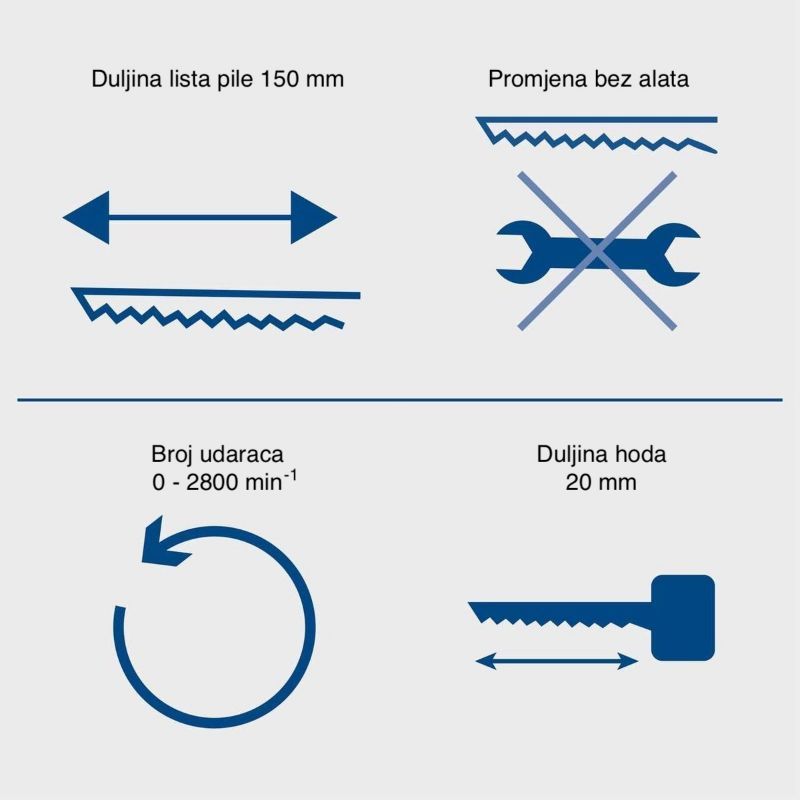 Brzina hoda je kontinuirano podesiva 0–2800 min⁻¹, a duljina hoda 20 mm. U praksi: viša brzina za drvo/plastiku (brži rez), niža brzina za metal (više kontrole i manje pregrijavanja lista). Hod 20 mm daje stabilan “griz” u materijal i dobar omjer brzine i kontrole kod univerzalnih radova.
