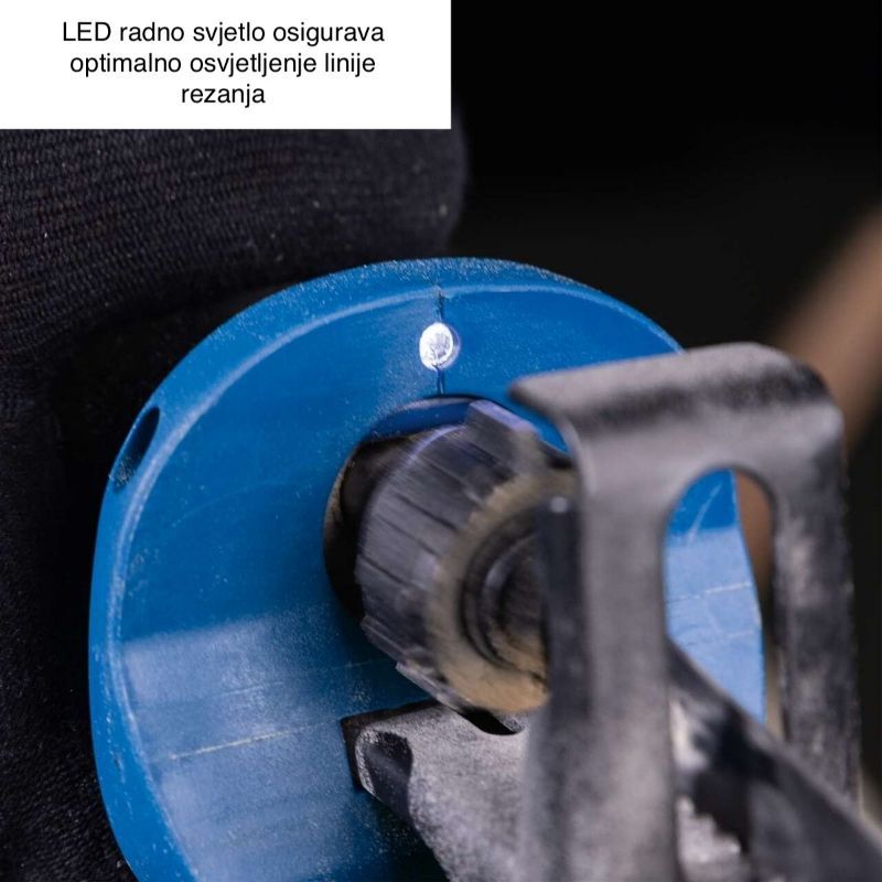 Da, LED je ugrađen. Najviše pomaže kod rezova u tamnim zonama (ispod konstrukcija, u kutovima, u podrumu, iznad glave) gdje vidljivost linije reza direktno utječe na točnost i sigurnost.