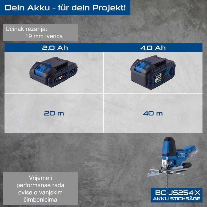 - Akumulatorska ubodna pila BC-JS254-X namijenjena je za ravne, kružne i kose rezove u drvu, plastici i metalu, uz rad bez kabela.