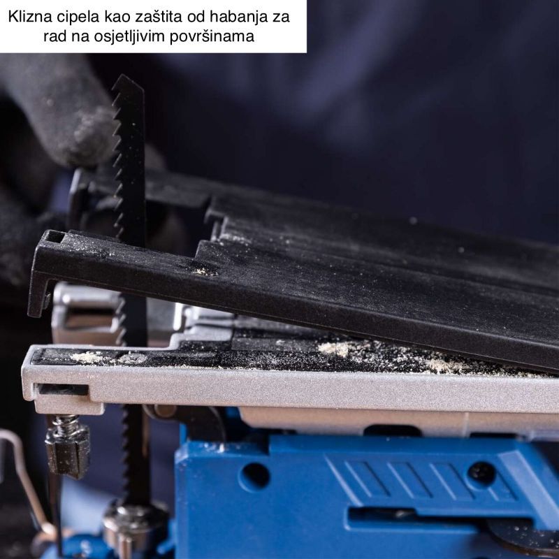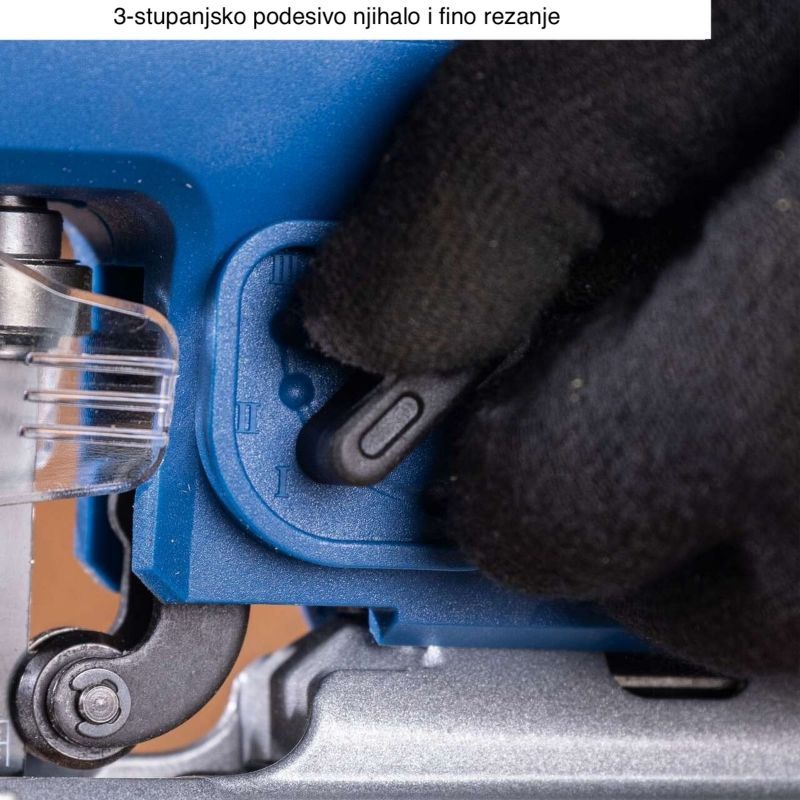 Brzina je podesiva u 6 stupnjeva od 1000 do 3000 udaraca/min. Niže brzine su racionalne za osjetljivije materijale i metal (kontrola i manja temperatura), a više brzine za drvo i brže rezove. Finalno podešavanje radite prema listu pile i ponašanju materijala na rezu.