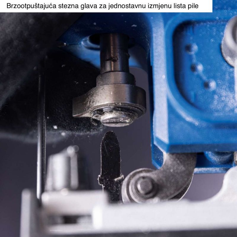 - Brzootpuštajuća stezna glava ubrzava zamjenu lista pile bez ključa, što je operativno bitno kad se radi na više materijala u istom zahvatu.