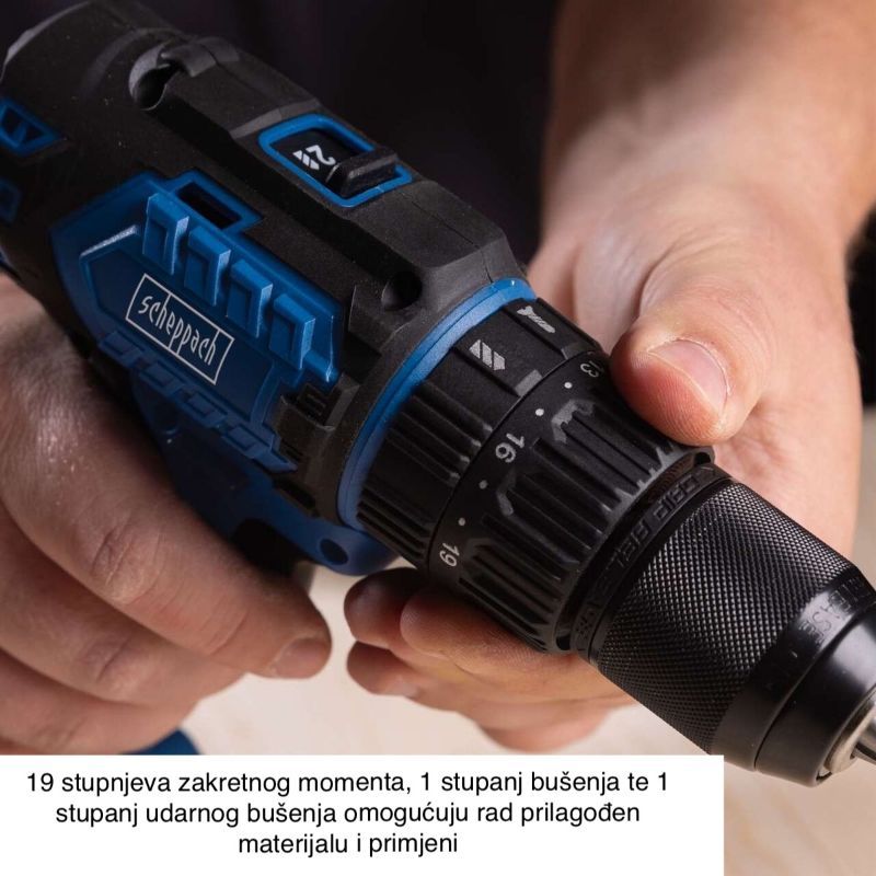 Ima 19 postavki momenta + 1 postavku bušenja + 1 postavku udarnog bušenja. Za osjetljive materijale (iverica, suhozid, plastika) koristite niže postavke momenta; za veće vijke i tvrđe materijale dižete postavku postupno do optimalne.