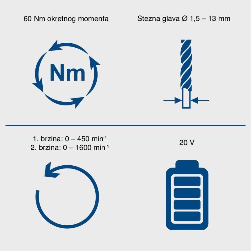 Maksimalni okretni moment je 60 Nm. U praksi: dovoljno za većinu vijaka i tipične radove montaže/renovacije. Ako redovito radite velike vijke, tvrdo drvo ili serijski zahtjevne poslove, tada je racionalno gledati jaču klasu ili udarni odvijač kao dopunu.