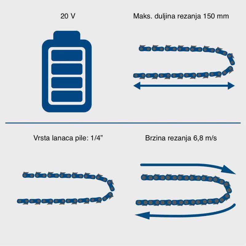 Maksimalni kapacitet rezanja je 150 mm, a brzina rezanja 6,8 m/s. Operativno: za najčišći rez i najmanje opterećenje lanca, radite s stabilnim osloncem i bez “forsiranja” kroz materijal.
