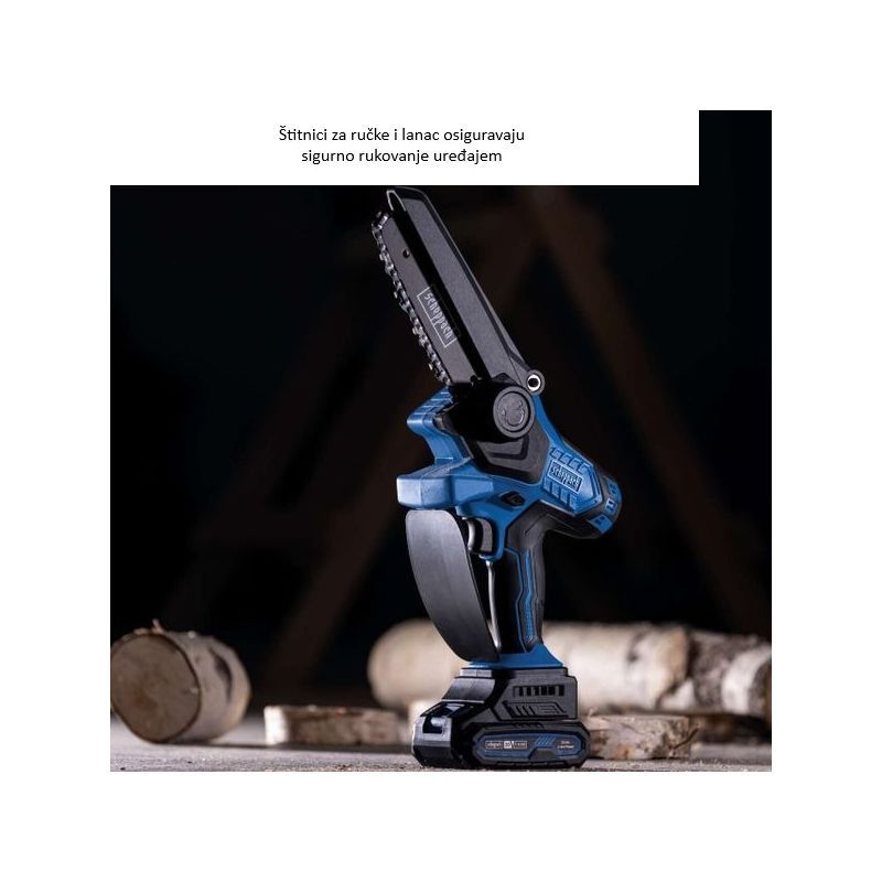 Ugrađeni su štitnik za ruku i štitnik za lanac, te sigurnosni prekidač na mekoj ručki. Minimum pravilnog rukovanja: držati reznu zonu stabilno, rezati dalje od tijela, ne rezati iznad razine ramena i ne raditi bez osnovne zaštite ruku i očiju, posebno kod rezanja suhog granja koje može “pucati”.