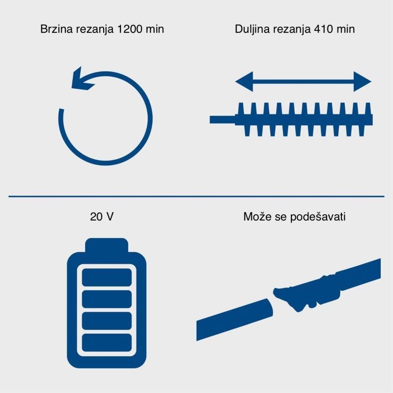 Duljina rezanja je 410 mm. U praksi to znači brži napredak po dužini živice (manje prolaza), uz dovoljno kontroliran rez za standardne vrtne živice.