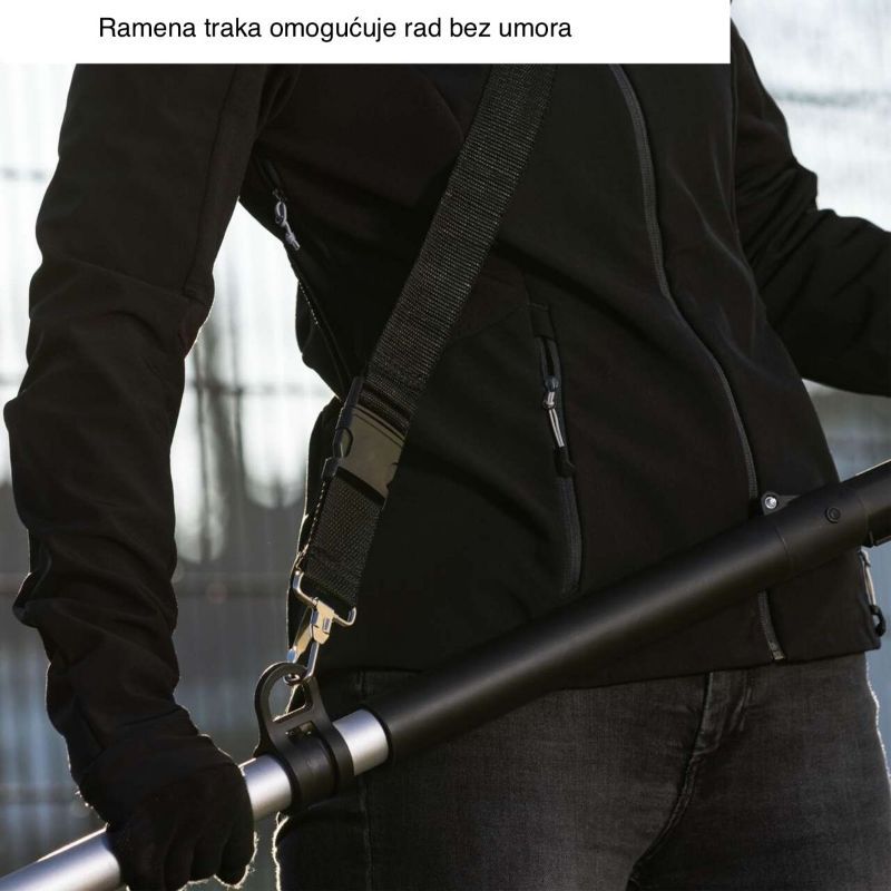 - Remen za rame preuzima dio mase pri duljem radu i stabilizira alat u izbačenom položaju.
