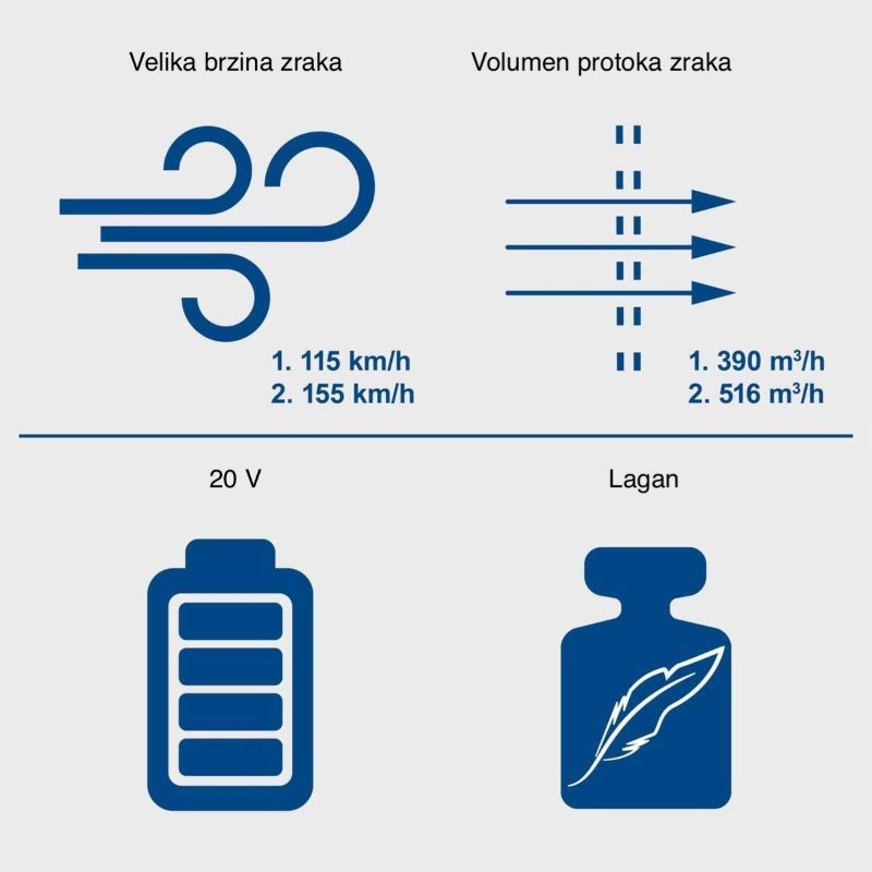Ima 2 stupnja: Stupanj 1 32 m/s (115 km/h), Stupanj 2 43 m/s (155 km/h). Operativno: Stupanj 1 za lagano lišće i “fino čišćenje” uz manju potrošnju energije, Stupanj 2 za veće hrpe, vlažnije lišće i brži napredak.