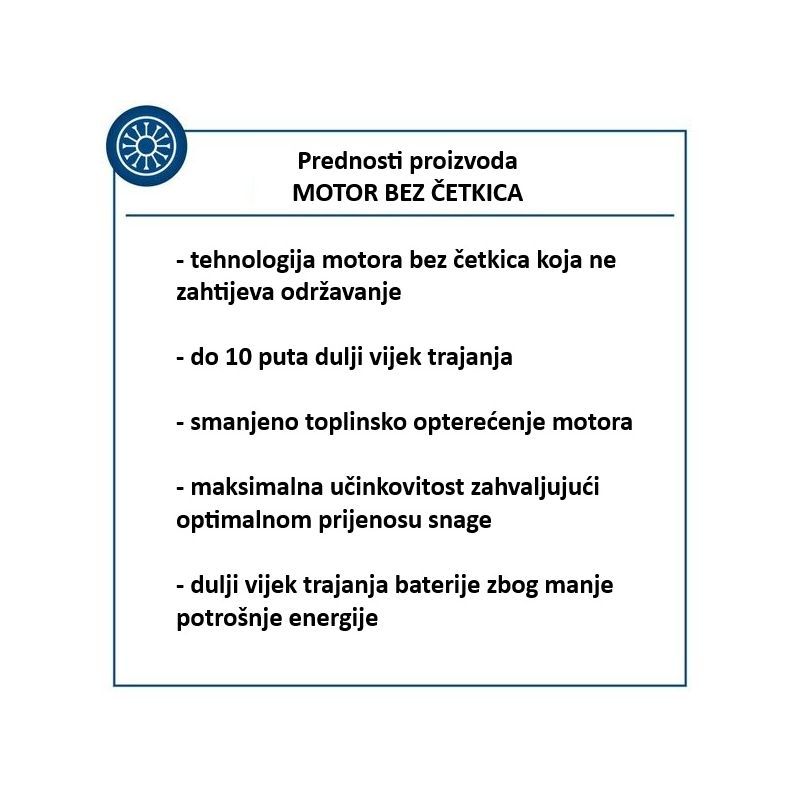 - Pogon je na 2×20 V (40 V), a uređaj je opremljen motorom bez četkica.