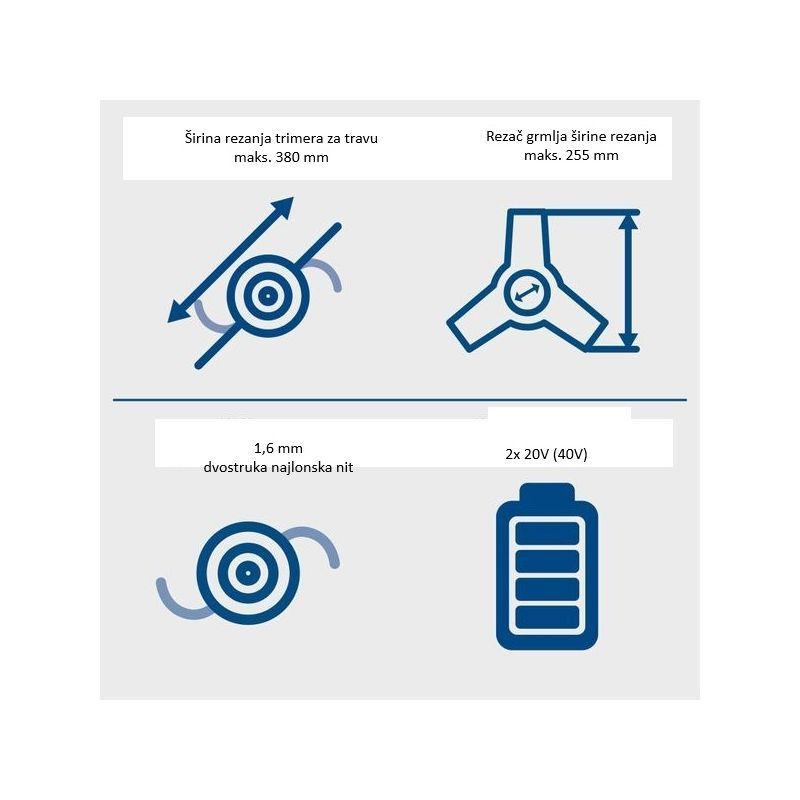 Širina rezanja s trimer glavom (nit) je 380 mm, a s nožem (kosa) 255 mm. To omogućuje brže “čišćenje” otvorenih površina s niti i učinkovitiji rad u gustoj vegetaciji s nožem.