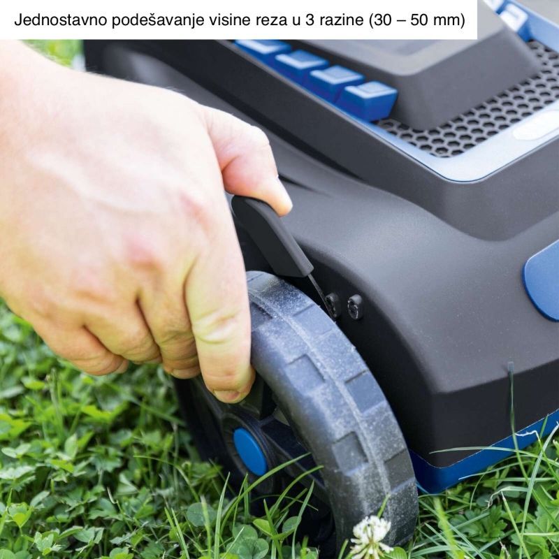 Visina košnje je podesiva u 3 stupnja: 30–50 mm. Niže (30 mm) je za uredan “finish” na redovno održavanom travnjaku; više (50 mm) je racionalno kada je trava jača/gušća ili kod prvih košnji nakon duže pauze.