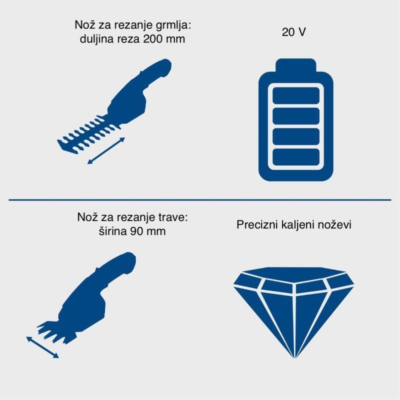 - Oštrica za travu širine 90 mm služi za precizne rubove uz staze i rubnjake, dok oštrica za grmlje duljine rezanja 200 mm pokriva obrezivanje manjih živica i topiarno oblikovanje.