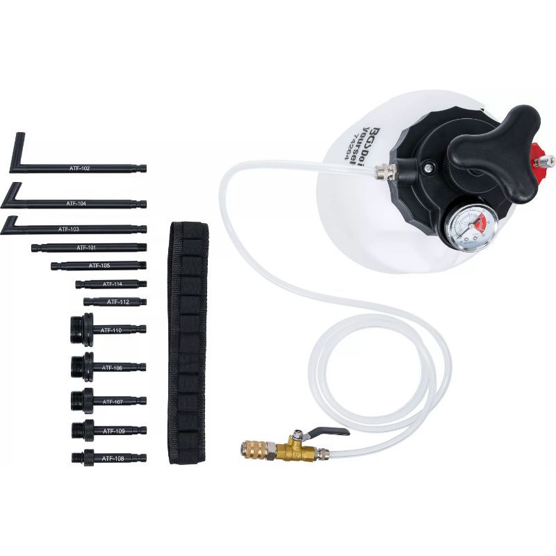- komplet uključuje 12 adaptera različitih navoja koji pokrivaju većinu standardnih priključaka za punjenje ulja u mjenjačima, uključujući navoje za Ford, BMW, Audi, VW, Mercedes Benz, Nissan, Volvo i druge