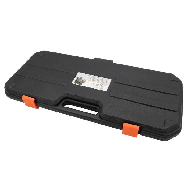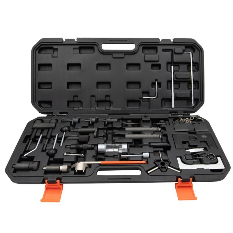 Set uključuje više specijaliziranih alata, uključujući: alat za blokiranje remenice radilice za okrugle zube (točka blokiranja na 12 sati) i zasebno za ovalne zube (točka blokiranja na 1 sat) za PD TDI aplikacije; alat za blokiranje pumpe ubrizgavanja za širok raspon TDI/SDI/PD/CR izvedbi; alat za blokadu bregaste (više izvedbi uključujući 2.5 TDI i 1.2 V6/V12), alat za razvodni lanac za 1.8T/2.0 i veće benzinske izvedbe, te podesivi alat za zupčasti mehanizam. Bitno: odabir “okrugli/ovalni” blokatora remenice je kritičan jer pogrešna točka blokade daje krivu referencu.