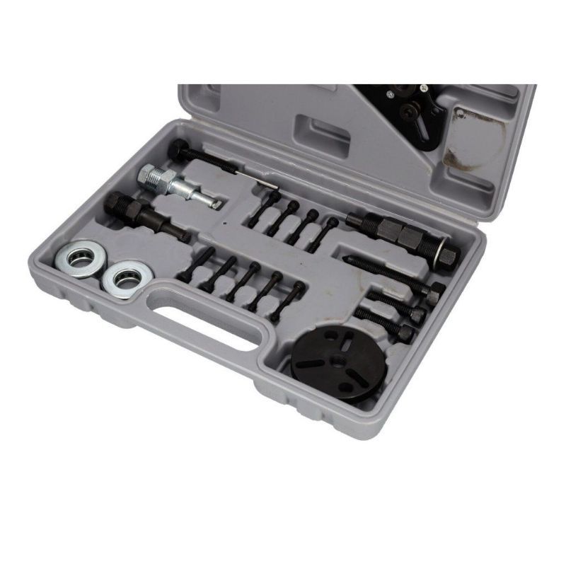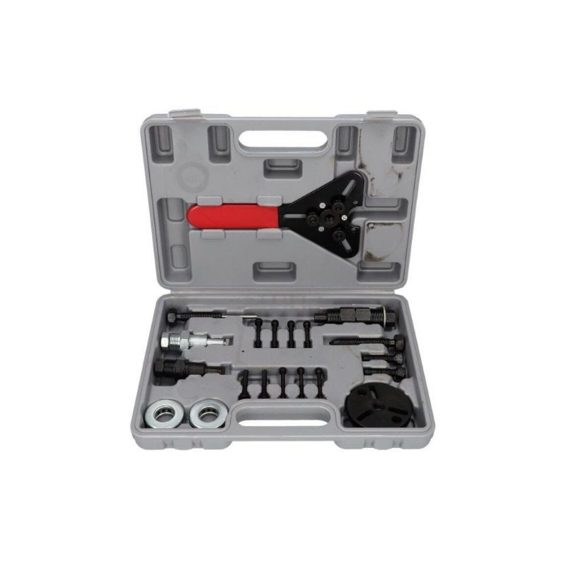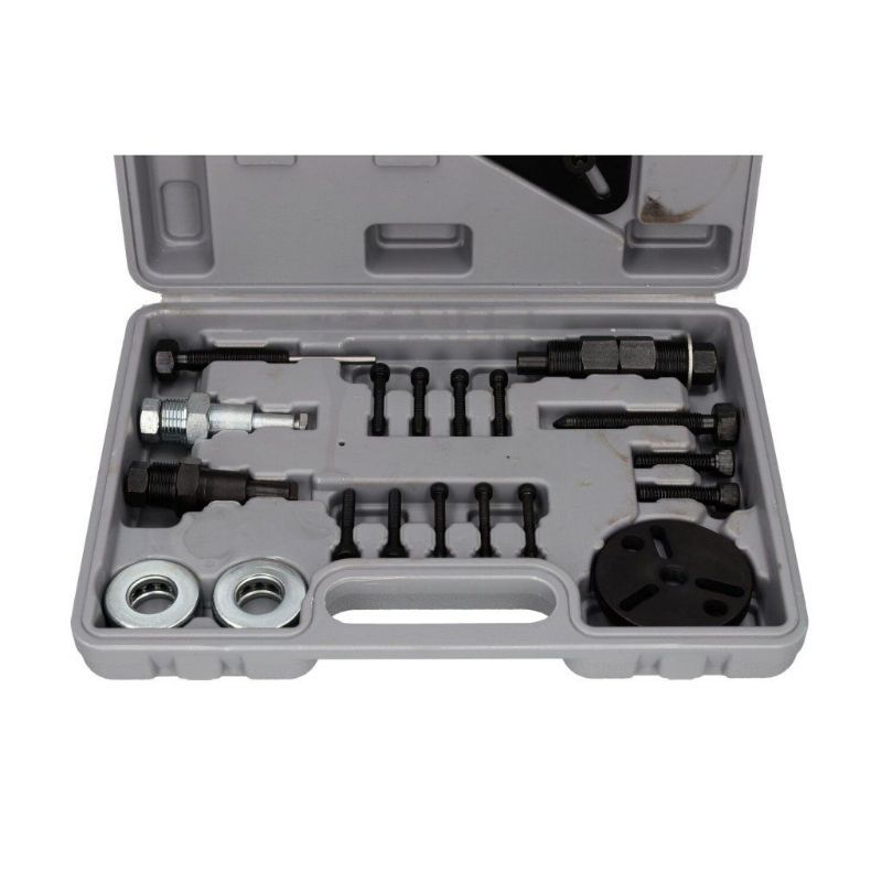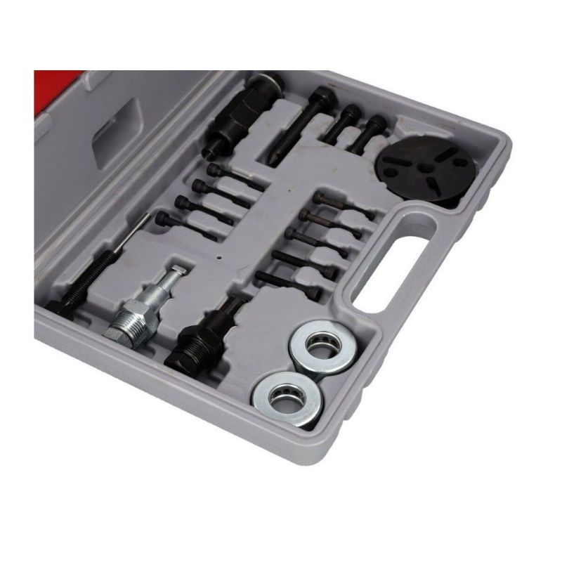Set je namijenjen za demontažu i montažu remenice, spojke i ležaja A/C kompresora bez skidanja cijelog kompresora iz vozila. Omogućuje precizan rad uz kontrolu sile i pozicije.