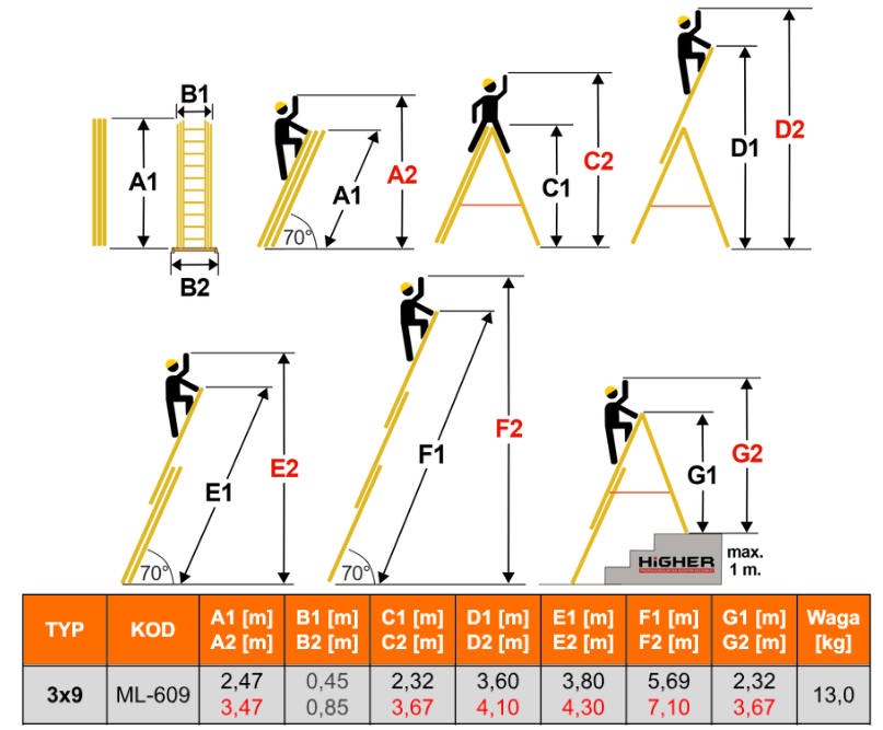 • 3x9 aluminijske ljestve nude maksimalnu radnu visinu od 7,10 m i transportnu duljinu od samo 2,42 m