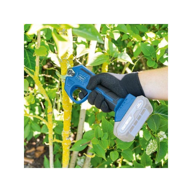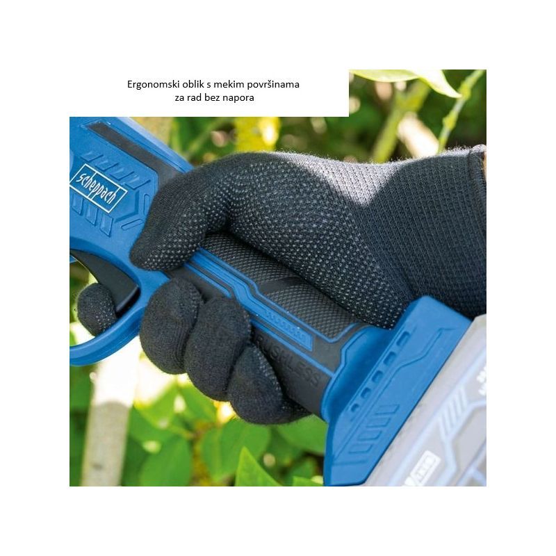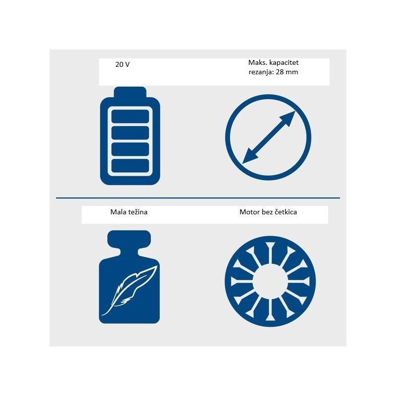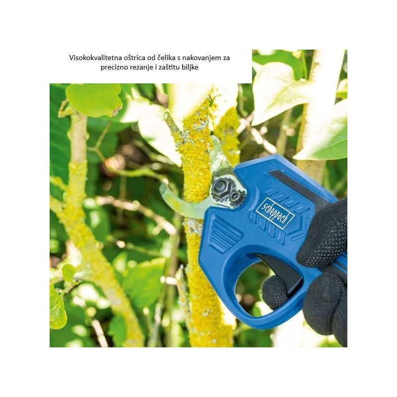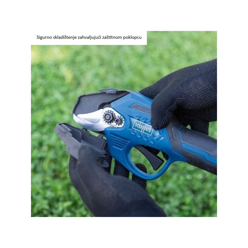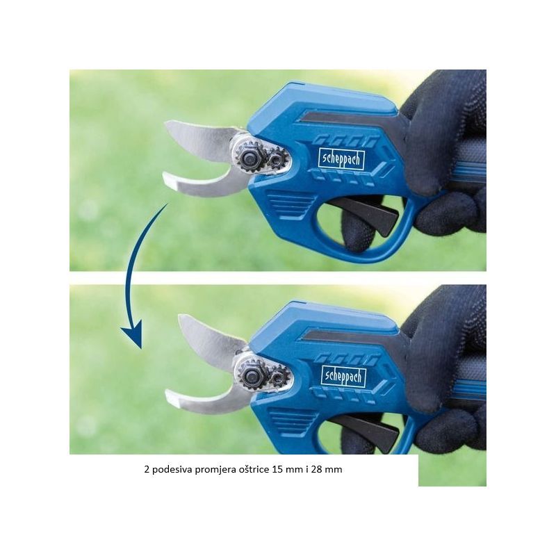 - akumulatorske škare za orezivanje za rezanje grana i izdanaka u vrtu, s maksimalnim promjerom rezanja do 28 mm i dodatnim režimom za 15 mm