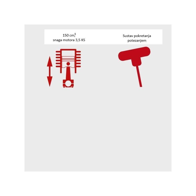 Motor je 4-taktni, zapremnine 150 cm³, snage 3,5 KS (2,6 kW), s maksimalnim okretajima 2800 o/min. U praksi: 150 cm³ i 3,5 KS daju dovoljnu rezervu za pouzdan rez u duljoj i vlažnijoj travi (uz racionalan odabir visine košnje i tempo košnje).