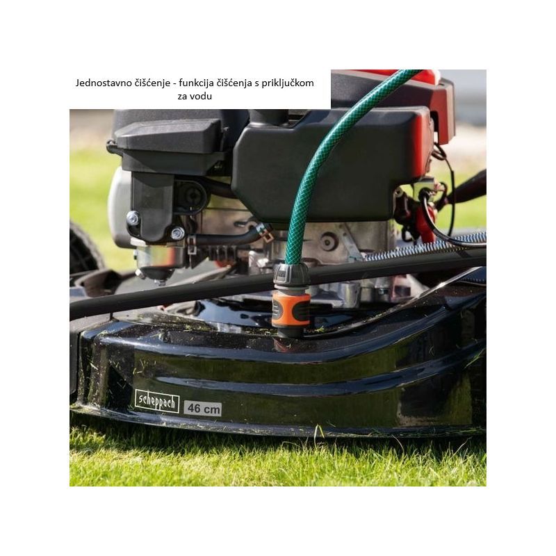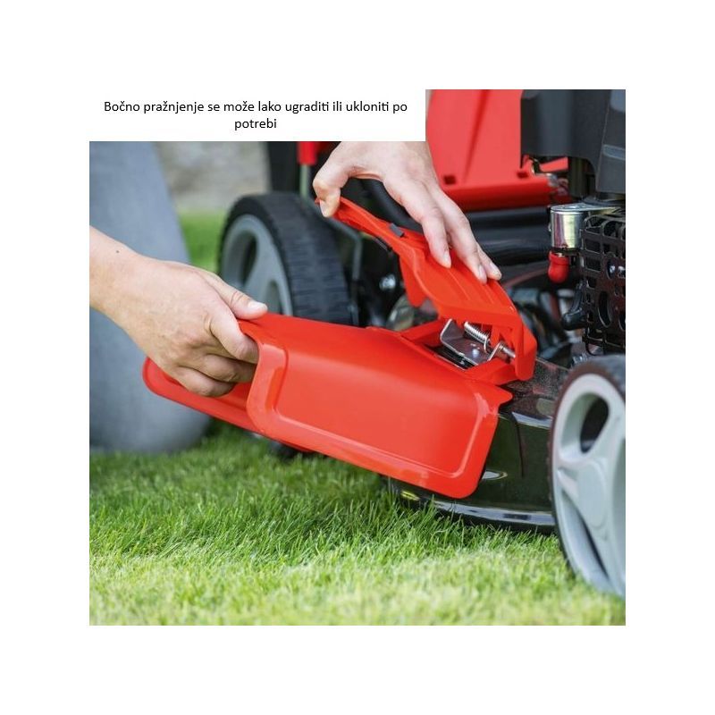 - Kosilica podržava malčiranje i bočno izbacivanje. Integrirana funkcija čišćenja s priključkom za vodu predviđena je za ispiranje unutrašnjosti kućišta nakon košnje.