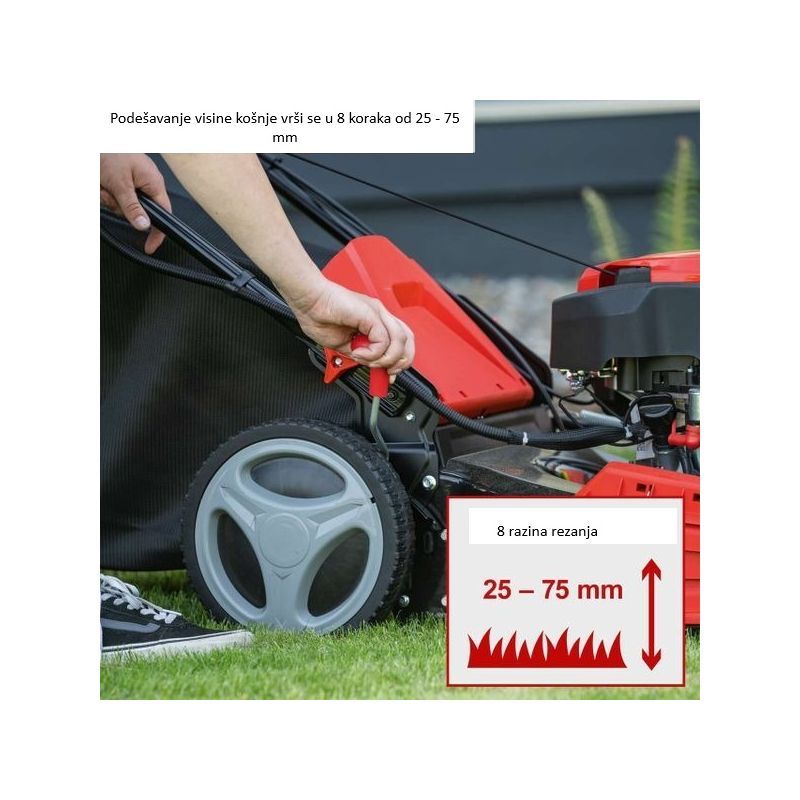 - Širina košnje je 460 mm, a visina košnje se podešava u 7 koraka u rasponu 25–75 mm.