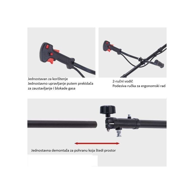 Ugrađeni su prekidač za zaustavljanje i blokada gasa. Operativno: stop prekidač omogućuje brzo gašenje, a blokada gasa smanjuje rizik nenamjernog “davanja gasa” tijekom manipulacije ili premještanja.
