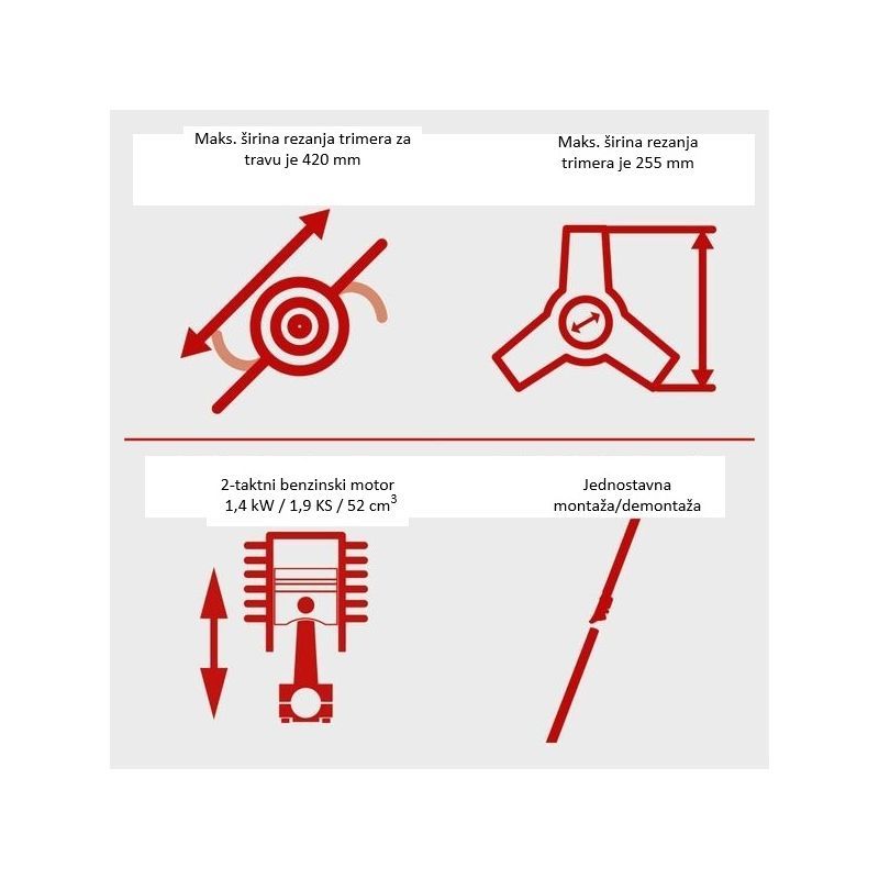 - Za košnju rubova i travnjaka koristi se rezni sustav sa strunom, sa širinom košnje 420 mm