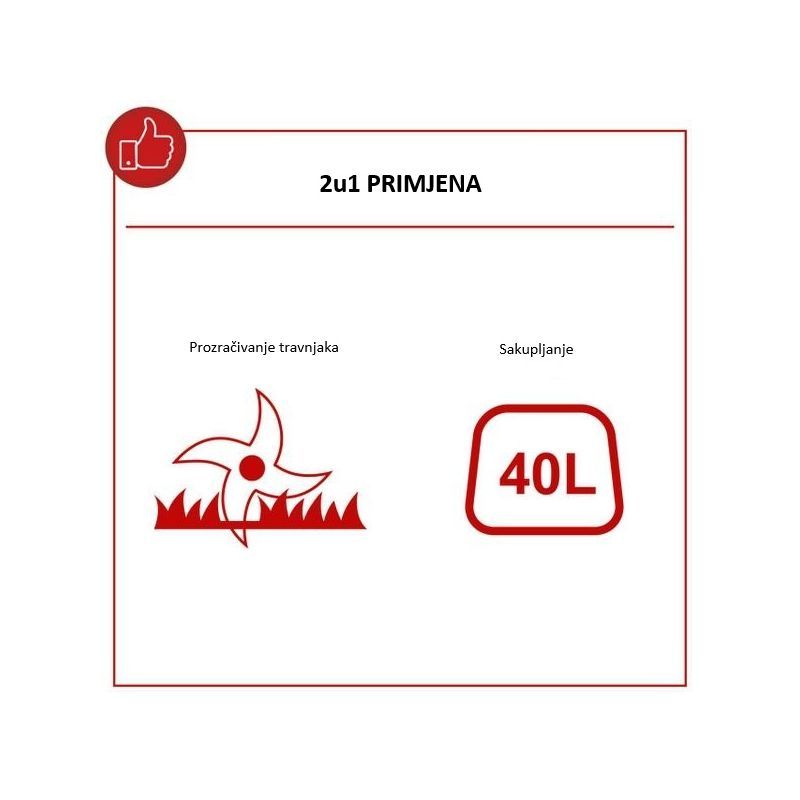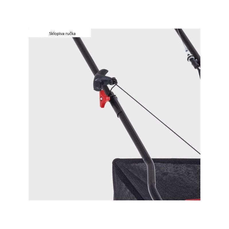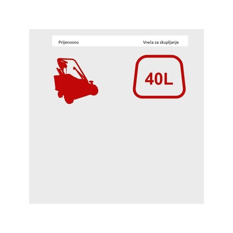 Vreća za sakupljanje je 40 L. Kućište je metalno, kotači su veliki i prilagođeni travnjaku, a ručka je sklopiva za transport i uštedu prostora. Neto masa je 27,99 kg, što doprinosi stabilnosti pri radu (manje “poskakivanja”) ali treba računati na fizičko manevriranje kod transporta.