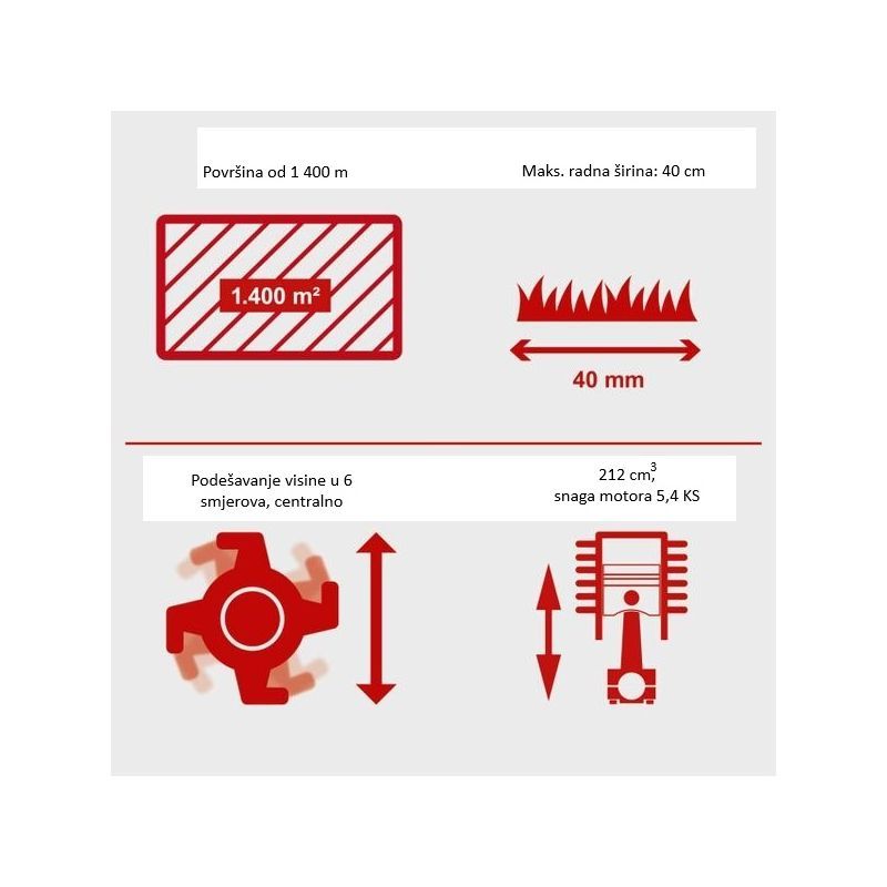 Preporučen je za travnjake do 1400 m², uz radnu širinu 40 cm. Širina od 40 cm je operativno pogodna za brži napredak na većim površinama, uz razumnu upravljivost u dvorištima i oko rubova.