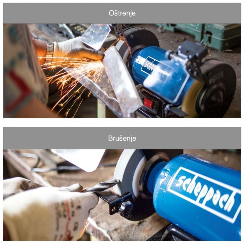 Dvostruka brusilica je namijenjena za grubo oblikovanje, uklanjanje neravnina (odsrakivanje) i precizno oštrenje metalnih alata i dijelova. Kombinacija dva kotača različite granulacije omogućuje da na istom stroju napravite i brzo skidanje materijala i fino doterivanje ruba.