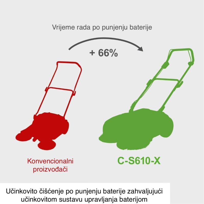 Radna širina je 610 mm. Operativno: širina 61 cm znači manje prolaza po površini i brže čišćenje dugačkih prilaza i terasa u odnosu na klasičnu metlu ili užu čistačicu.