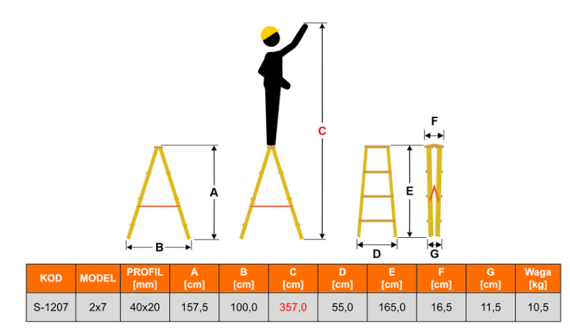 Radne visine ljestava su približne i okvirne, jer ovise o visini korisnika. Radne visine označene su crvenom bojom.