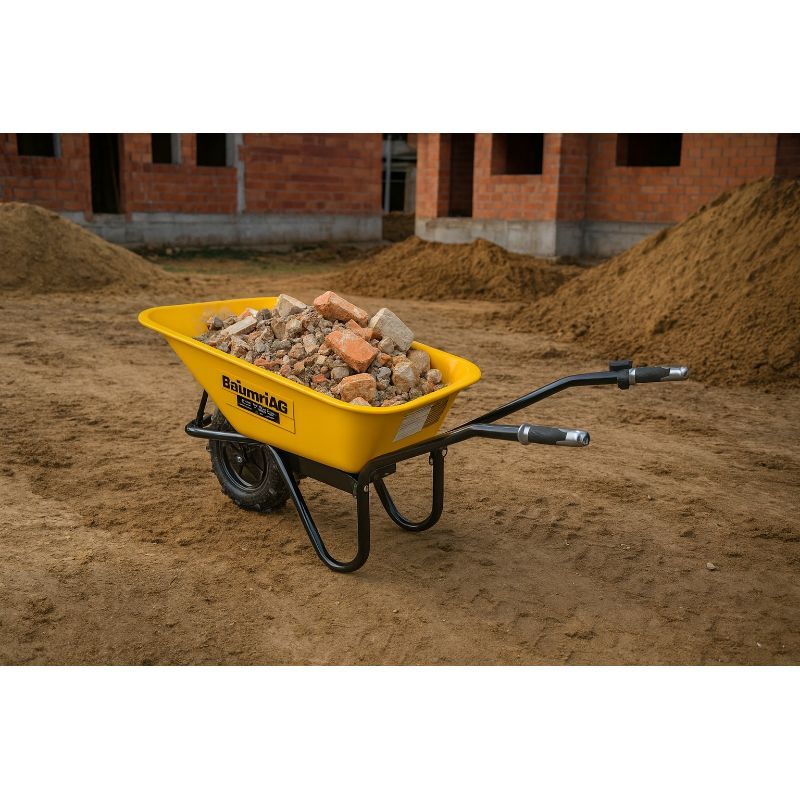 - kolica imaju čeličnu konstrukciju s praškastim premazom, kapacitet posude 100 L i stabilan prednji pneumatski kotač 16x5" s V-profilom, što osigurava upravljanje i stabilnost na neravnom terenu