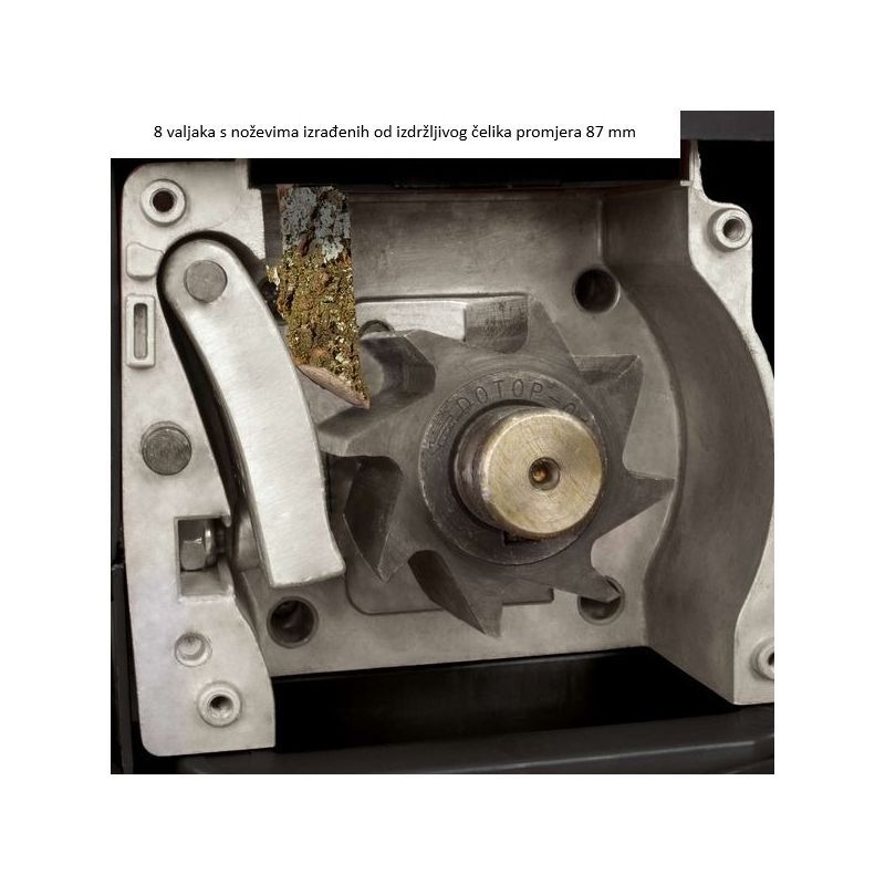 - tihi usitnjivač za vrtni otpad s valjkastim sustavom rezanja i mehanizmom bez povratnog udara