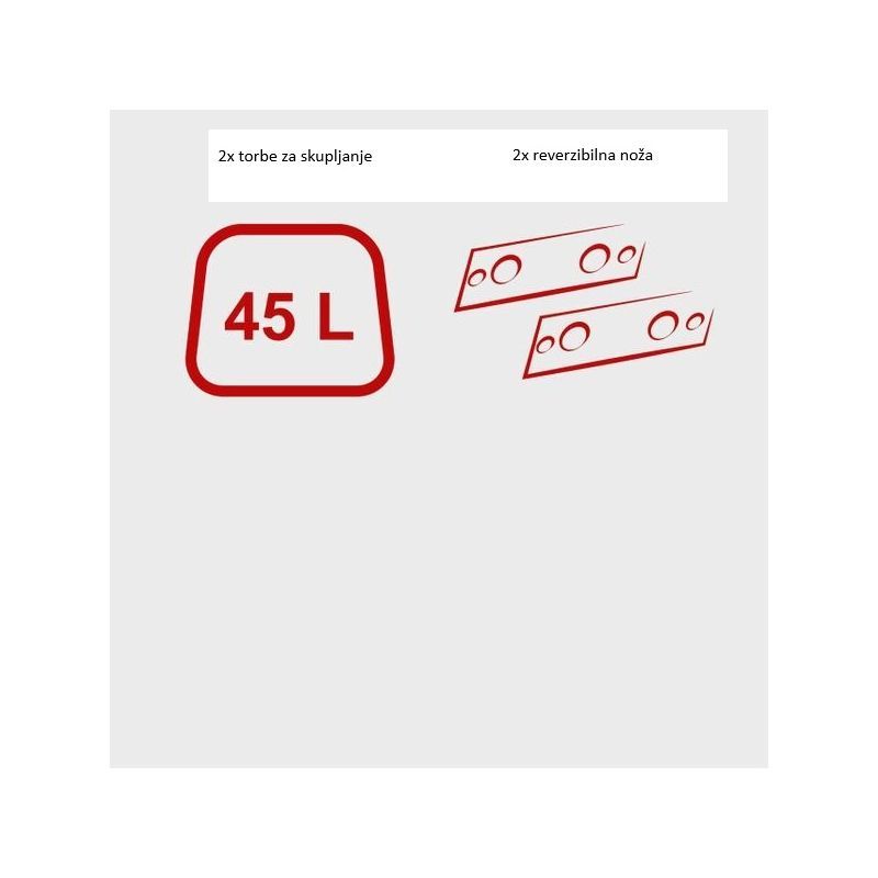 Volumen spremnika/vreće za sakupljanje je 45 l. U praksi: kod svježeg zelenog otpada punjenje će biti brže, dok suhe grančice daju “rjeđi” volumen; redovno praznite kako se ne bi smanjio protok materijala.