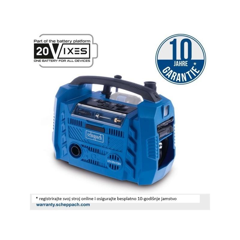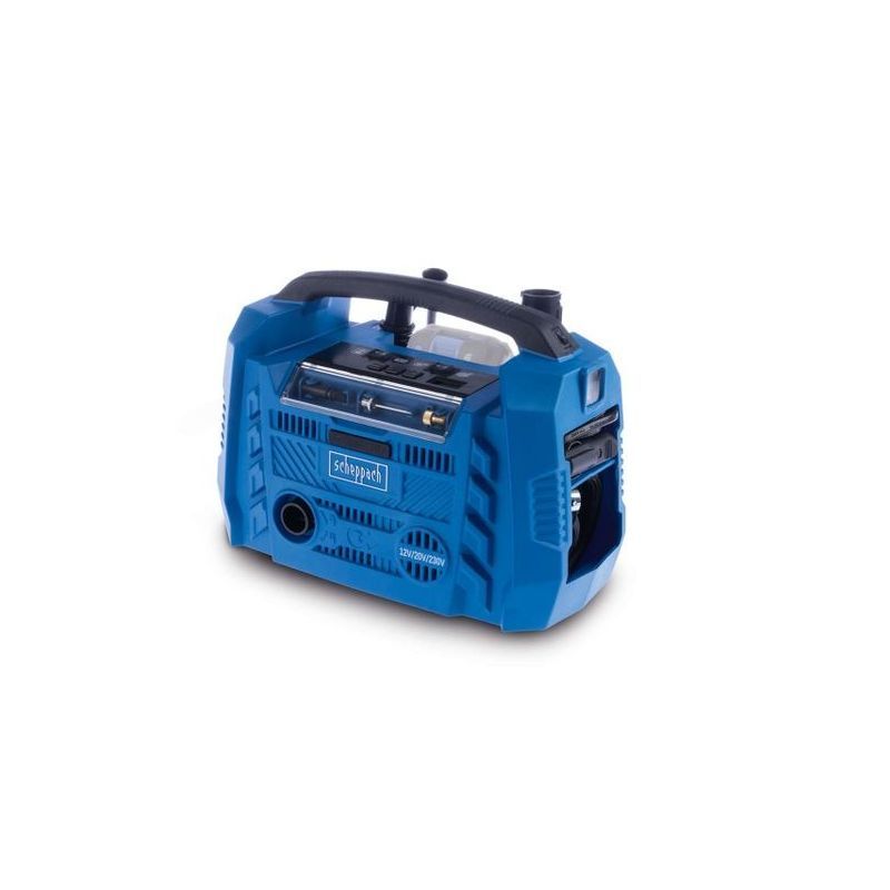 Ovaj hibridni kompresor podržava 3 načina napajanja: 230 V (mreža), 12 V (utičnica u vozilu) i 20 V bateriju (Li-ion). Operativno: isti uređaj pokriva garažu, put i teren bez improvizacija – birate izvor napajanja prema situaciji.
