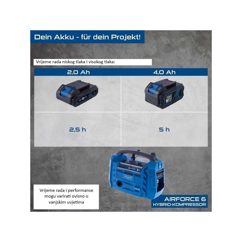 - Airforce 6 je mobilni kompresor za napuhavanje guma, lopti i opreme na napuhavanje, s napajanjem preko mreže 230 V / 50 Hz, 12 V priključka u vozilu ili 20 V Li-ion baterije