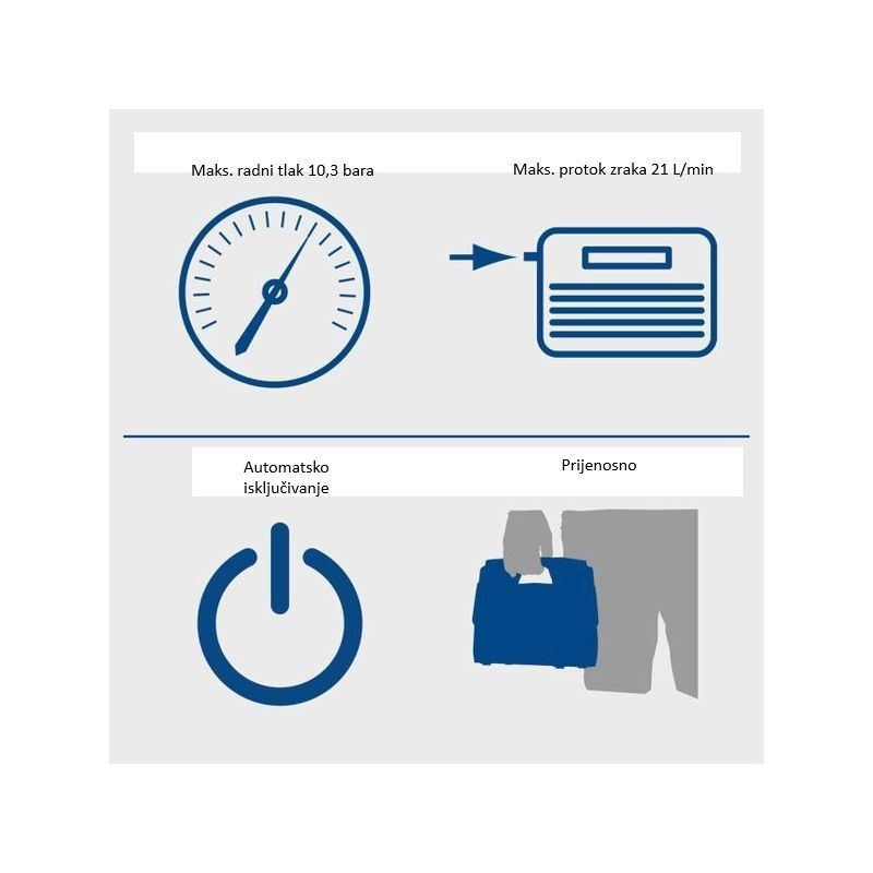 Usisni kapacitet je 21,0 l/min. U praksi je to namijenjeno za napuhavanje i kratke zadatke komprimiranog zraka; nije zamjena za radiončki kompresor s kotlom kada trebate kontinuiran rad pneumatskih alata.