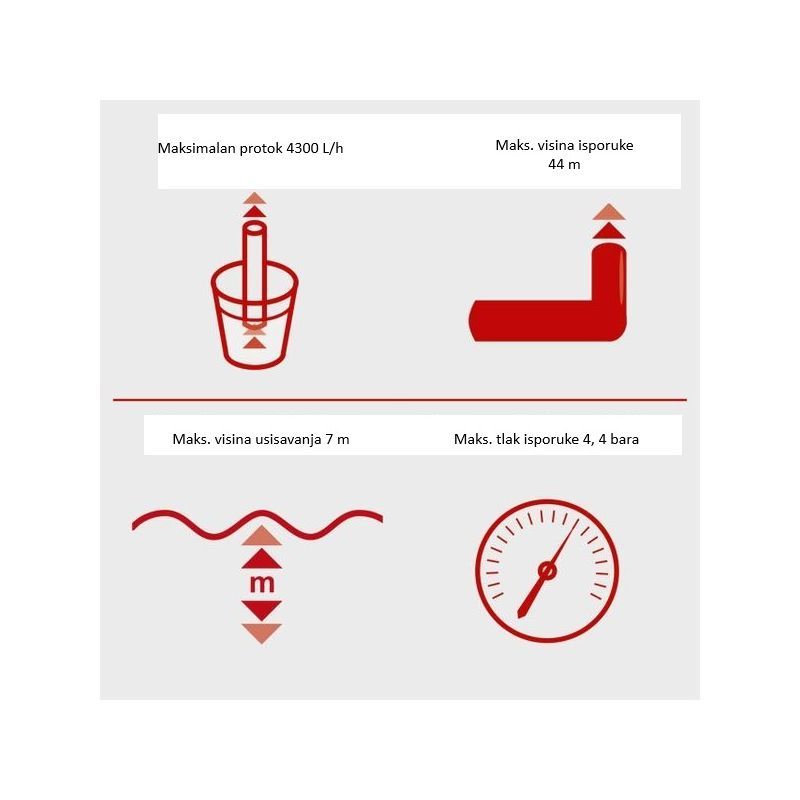 - Maksimalna visina isporuke je 44 m, a usisna visina do 7 m.