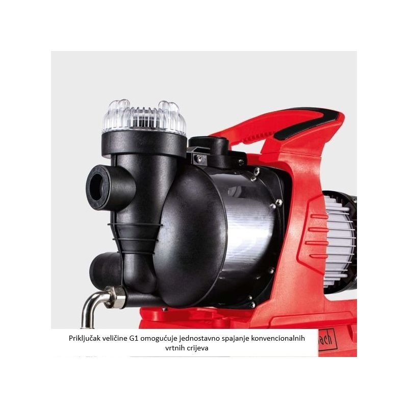 - Usisni i tlačni priključci G1" omogućuju standardno spajanje instalacije i vrtnih crijeva.