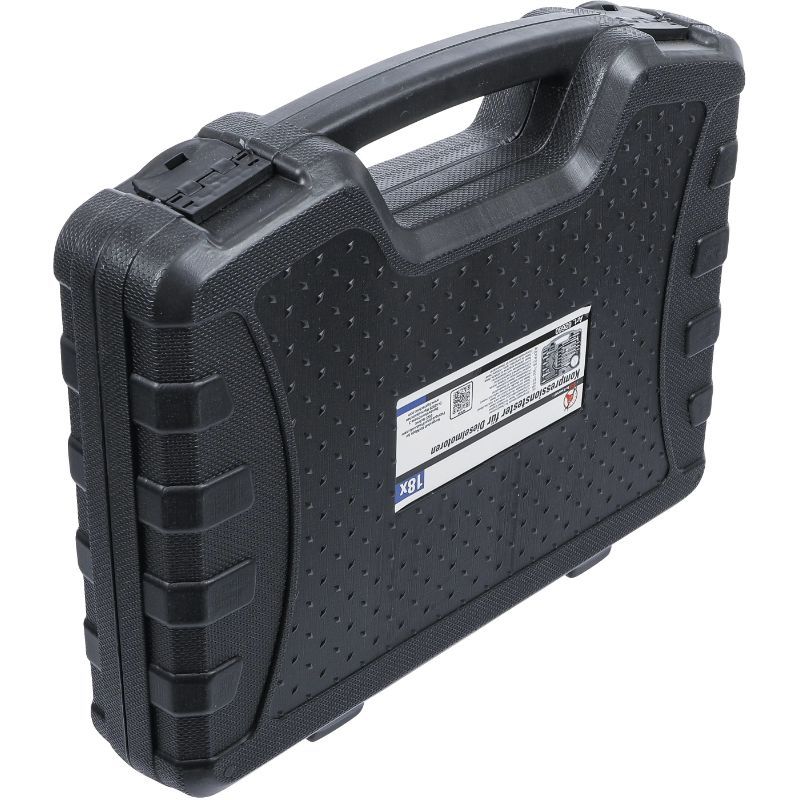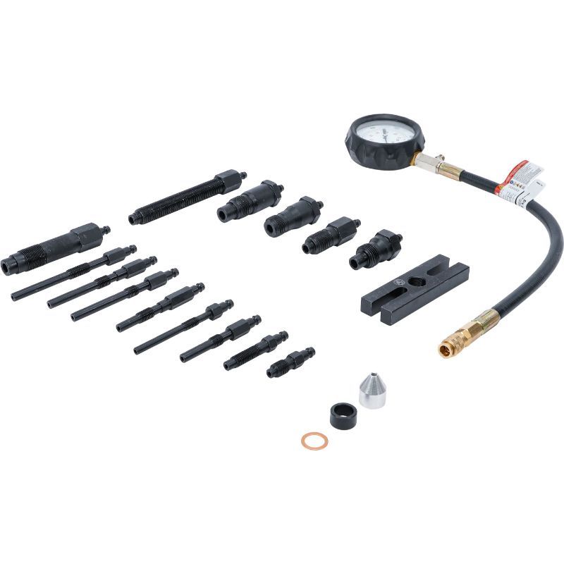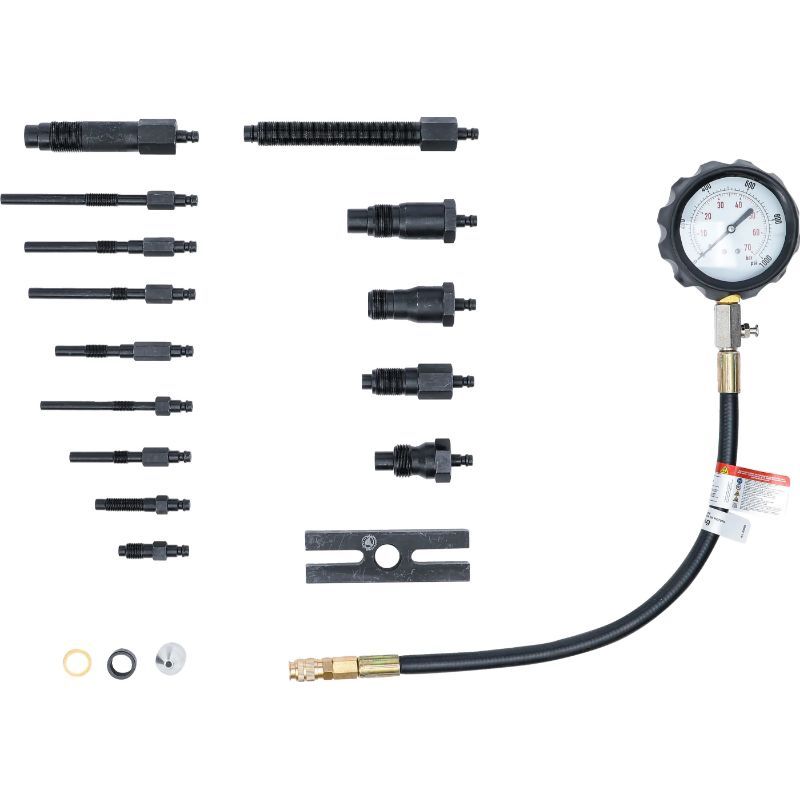 Set uključuje manometar do 70 bara s crijevom duljine 500 mm i tolerancijom ±5%, više adaptera za grijače (M8x1.0, M10x1.0, M10x1.25, M12x1.25) te adaptere za injektore (M20x1.5, M22x1.5, M24x1.5, M24x2.0), uključujući cijev adaptera M18x1.5. To je važno jer se dijagnostika dizelskih motora ne može raditi kvalitetno bez odgovarajućeg navoja i pravilnog brtvljenja na mjernom mjestu.