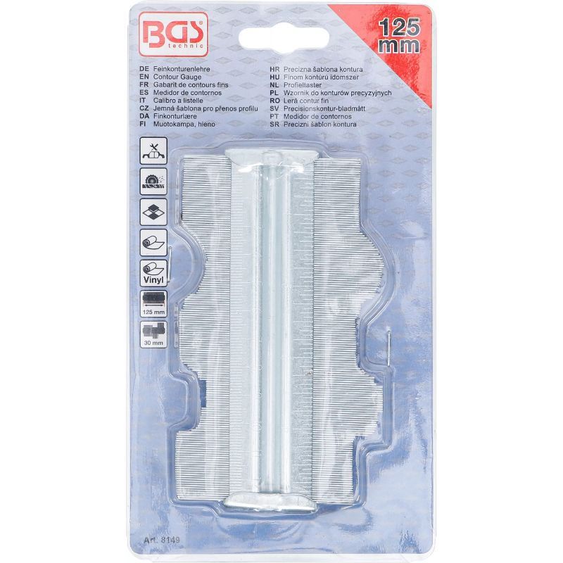 BGS 8149 je kontomjer za brzo kopiranje i prenošenje kontura/oblika (npr. karoserija, letvice, profili). Koristi se kad trebate prenijeti “nepravilan” oblik na drugi materijal ili označiti rez bez višestrukog mjerenja. Maksimalna širina mjerenja je 125 mm.