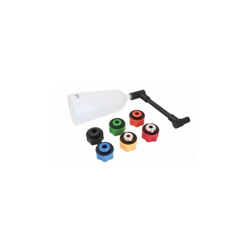 U setu je lijevak kapaciteta 1,5 L, zakretni nastavak/krak s podešavanjem položaja do 180° i 6 adaptera za različite tipove otvora čepa za ulijevanje. Ukupno je 8 dijelova. Kapacitet od 1,5 L smanjuje broj prekida tijekom dolijevanja, a zakret do 180° pomaže kad je otvor “uvučen” ili blokiran plastičnim poklopcima.