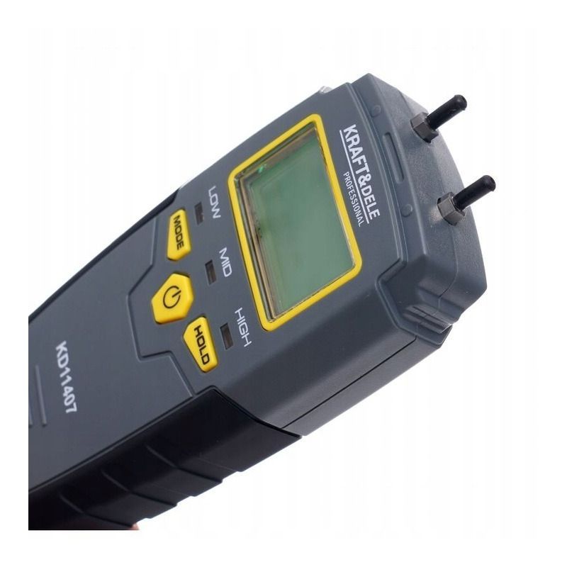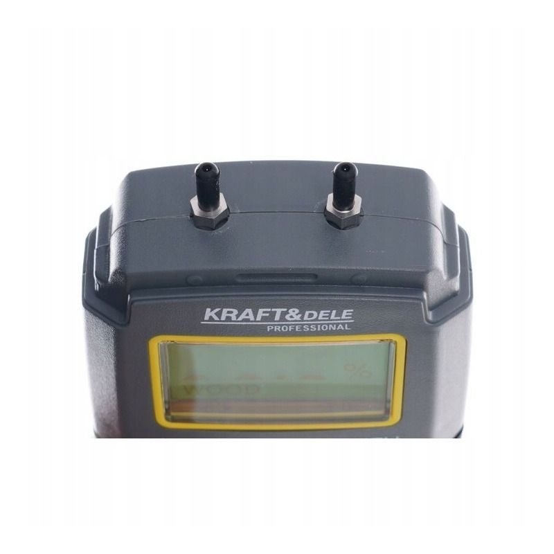 Mjerač vlage za drvo i građevinske materijale s LCD zaslonom i prikazom sadržaja vlage putem pinova.
