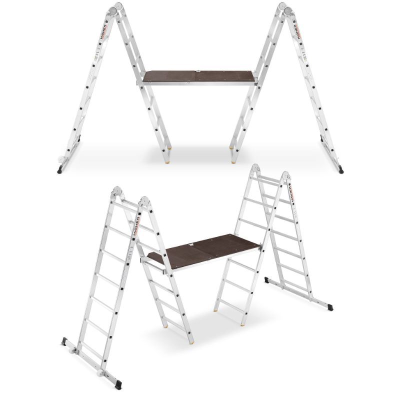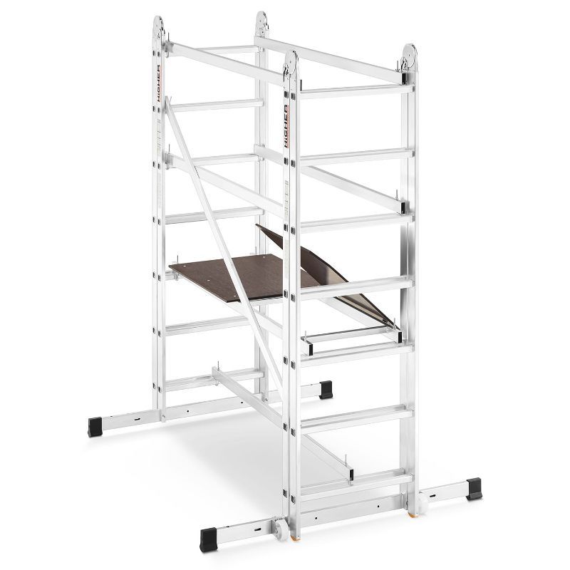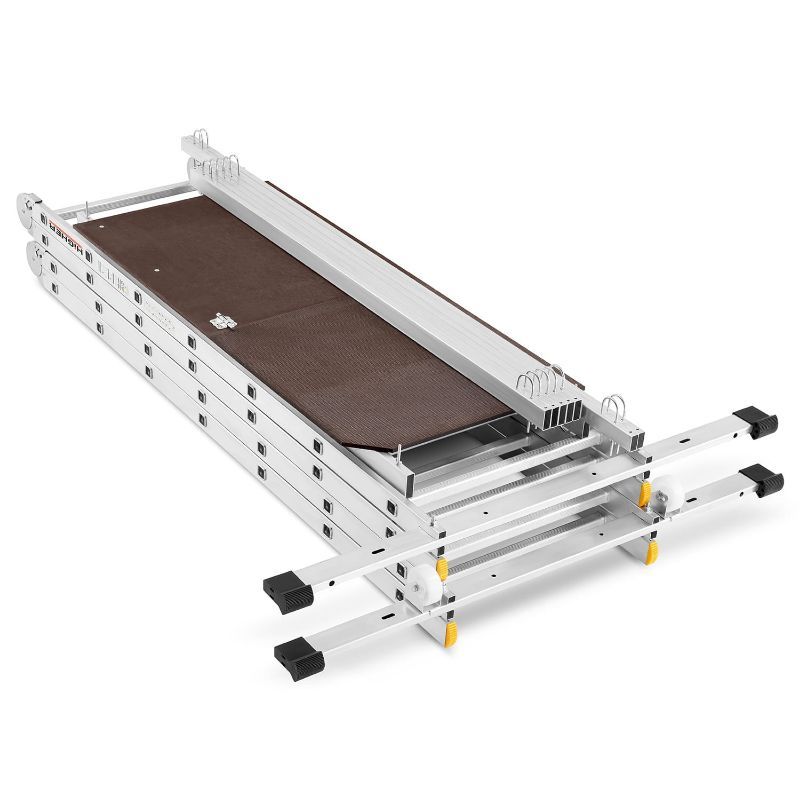 Zglobni sustav omogućuje da se proizvod koristi u više konfiguracija rada na visini. Konstrukcija se može pretvoriti u mobilnu skelu, samostojeće ljestve, naslonjene ljestve ili radnu platformu između dva okvira. To znači da jedan sustav može zamijeniti više različitih alata za rad na visini, što je praktično za gradilišta i radionice.