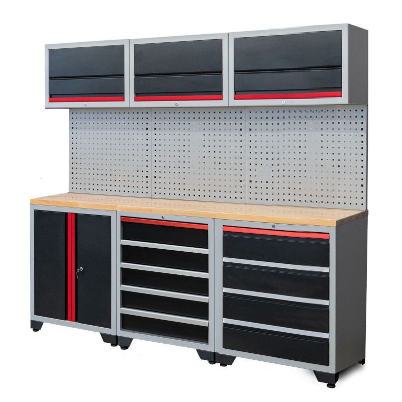 U setu su: 3 zidna ormarića (710 × 330 × 460 mm), 3 perforirane ploče za alat (740 × 640 mm), 1 donji ormarić s 2 vrata i 2 police, 1 donji ormarić s 4 ladice, 1 donji ormarić s 5 ladica (sve 710 × 510 × 900 mm) te 1 radna ploča (2130 × 507 × 37 mm).