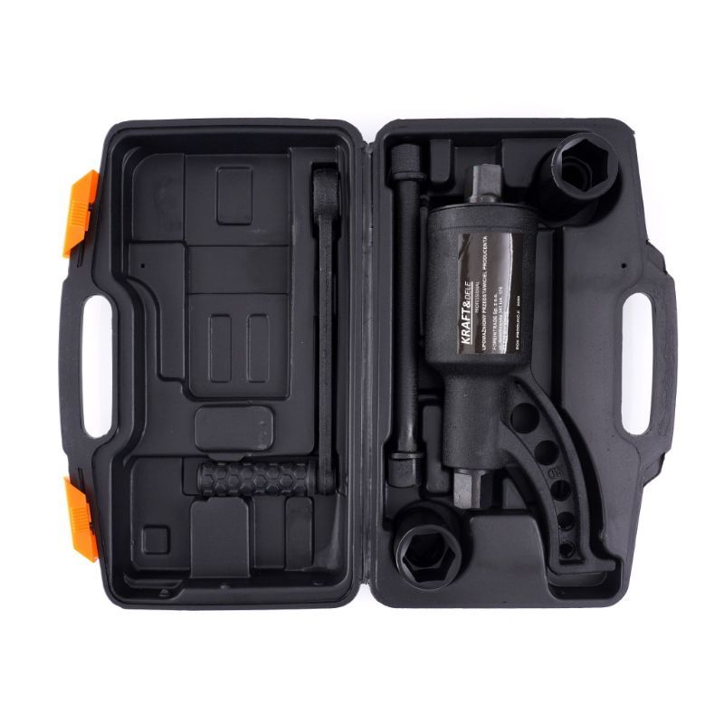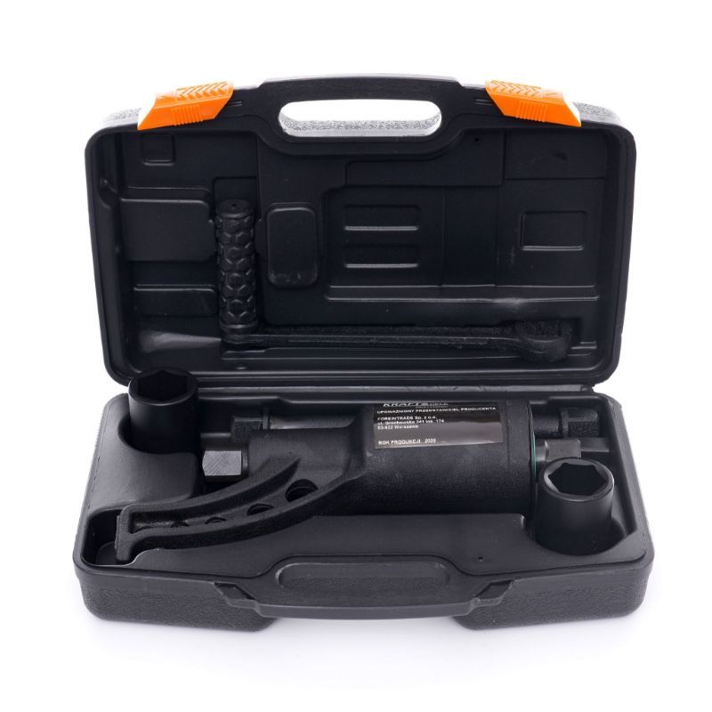 U kompletu se nalaze dvije nasadne čaure (npr. 32 mm i 33 mm), produžna poluga i metalna kutija za praktično spremanje i transport.