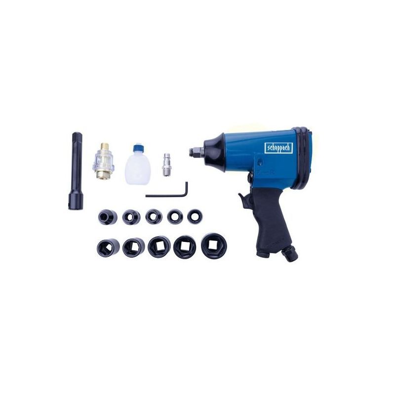 U setu su: udarni pištolj, 10 kom 1/2" nastavaka (9 / 10 / 11 / 13 / 14 / 17 / 19 / 22 / 27 mm), produžetak 85 mm, podmazivač i boca s uljem te torba za nošenje. (Napomena: u popisu veličina je navedeno 9 kom dimenzija; zadržano kako je dostavljeno.)