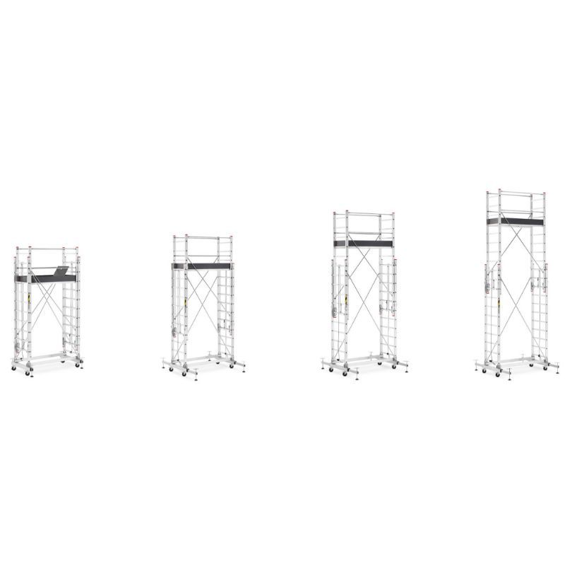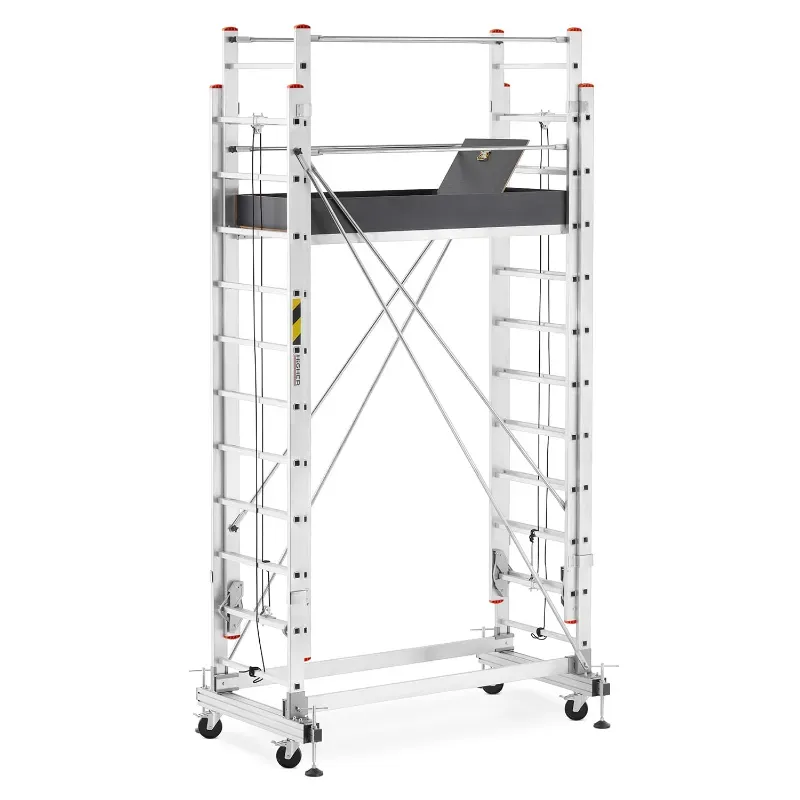 Da, podnožje skela ima kotačiće s nožnim kočnicama, a teleskopski sustav i koluti omogućuju brzo i jednostavno podešavanje visine.
